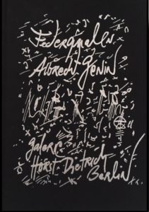 Albrecht Genin, Federqualen 1982-1984, 1991, Faksimile-Ausgabe des Unikat-Buches. 168 Seiten Federzeichnungen, Siebdruck in schwarzes Leinen gebunden, 30×21,5cm, Auflage 500, nummeriert & signiert € 100,- erschienen im Verlag Galerie Horst Dietrich